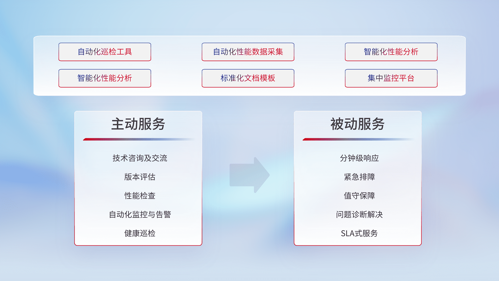 智能化工具和标准化文档,,,,保障服务质量,,,,提供主动服务(包含技术咨询、、、、版本评估、、性能检查、、、自动化监控与告警、、健康巡检)和被动服务包含(分钟级响应、、紧急排障、、、值守保障、、问题诊断解决、、SLA服务)。。。