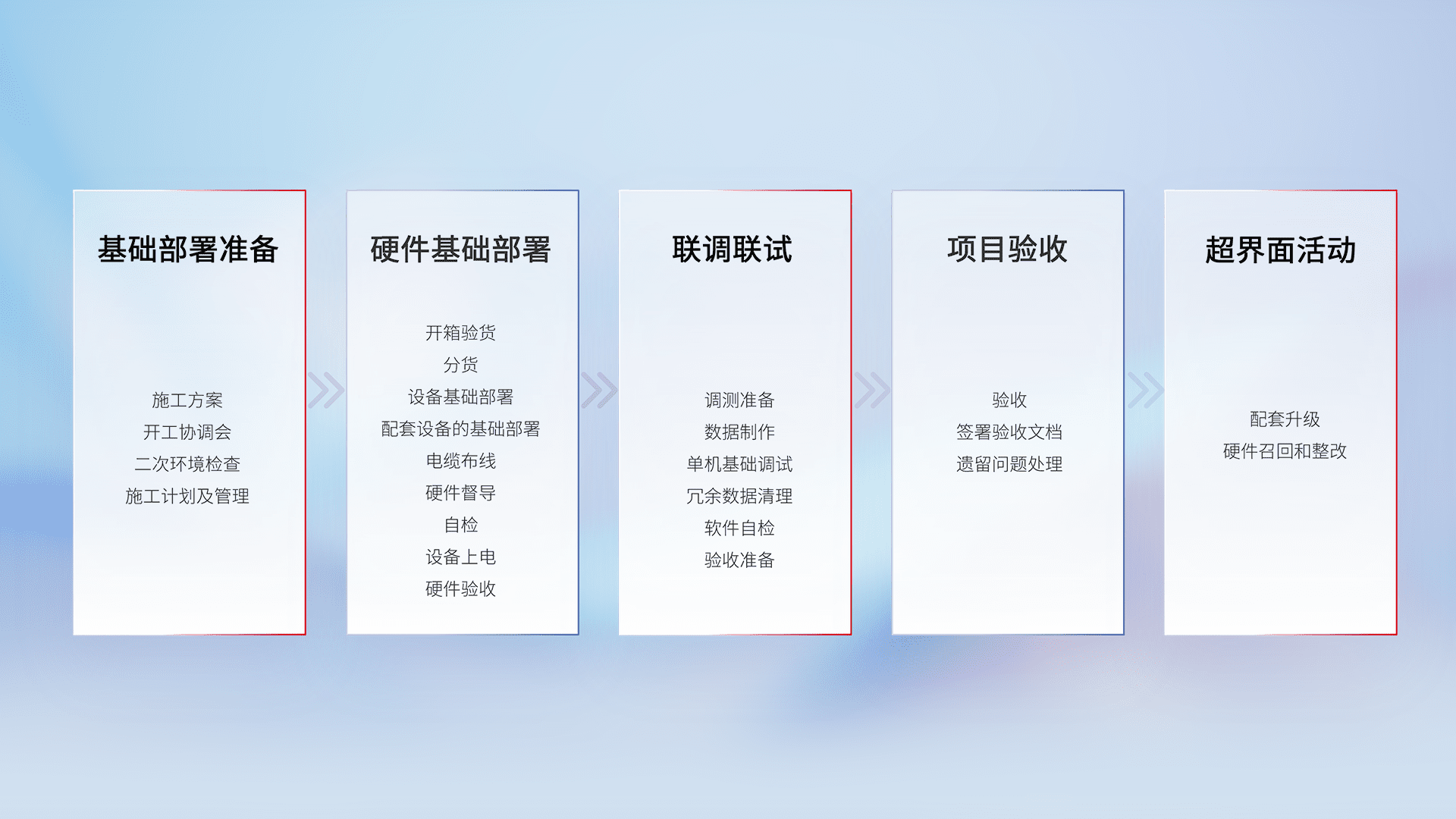 从基础部署准备、、、硬件基础部署、、联调联试、、、、项目验收、、、、越界面活动的全过程可追溯,,,,保证施工质量和进度。。。。